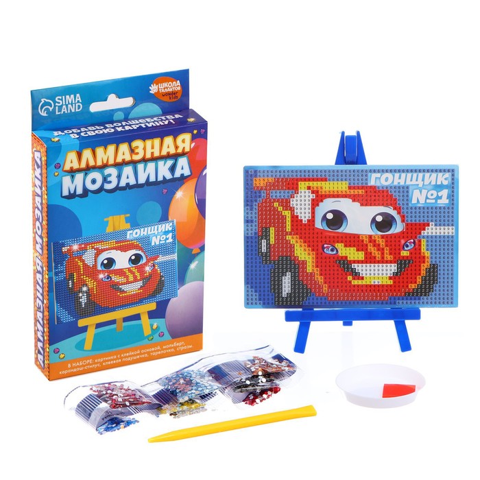 Алмазная мозаика для детей "Гонщик" + емкость, стержень с клеевой подушечкой