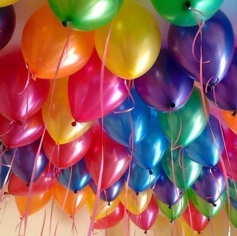 Облако из прекрасных латексных шаров. Шары типа "Металлик" , шары имеют металлический блеск, яркие цвета, все шары уже обработаны HiFloat, что позволяет летать шарам от 3 до 7 дней, в отличие от обычных шаров, которые летают до 12 часов