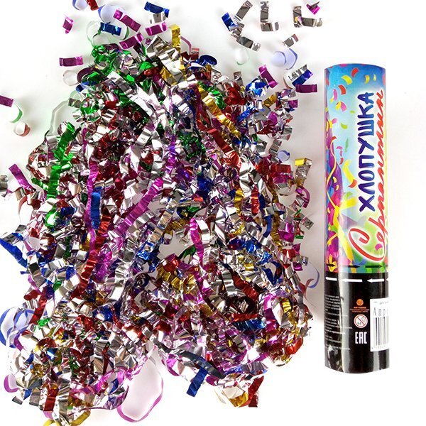 Фольгированный разноцветный серпантин. АБСОЛЮТНО БЕЗОПАСНО! "Выстрел" производится энергией сжатого воздуха, находящегося в баллоне хлопушки, поэтому пневматические хлопушки абсолютно безопасны.