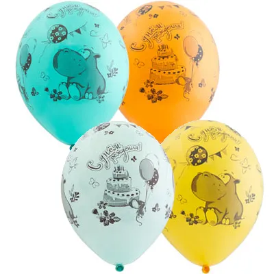 Одного типа - пастель. Шары с пятисторонним - круговая печать, шелкографическим рисунком С Днем Рождения. Бегемот с тортом.