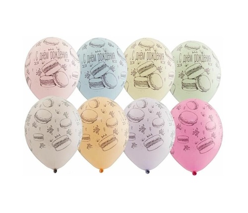 Нежные оттенки цветов Macaron. Шары с пятисторонним - круговая печать, шелкографическим рисунком С Днем Рождения. Макарун. Предназначен для розничной продажи воздушных шариков. Воздушные шары изготавливаются из экологически безопасного 100%-ного натурального латекса.