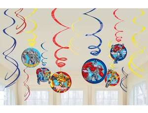 Декорация в виде фольгированных спиралей с подвешенными баннерами с изображением персонажей - декоративное украшение интерьера.