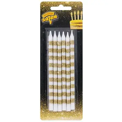 Декоративное украшение праздничного стола. Белая свеча с золотыми полосами. Размер свечи: 12см (H) * 0,7см (D). В упаковке 12 свечей.
