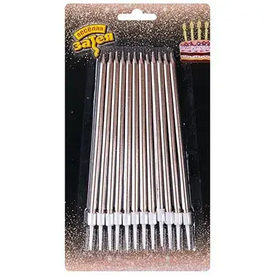 Украшение праздничного стола - металлизированные свечи цвета розовое золото. Отличное решение для декорирования торта, десерта ко Дню рождения, Романтическому ужину, Свадьбе, Юбилею, Новому году. Высота свечи 13см, диаметр - 0,5см, в упаковке 12 штук с подставками.