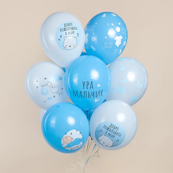 Воздушные шары Ура, Мальчик!, Белый/Голубой, пастель 30 см уже с гелием и обработкой